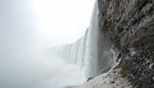 Perspektive von der Attraktion Journey Behind the Falls mit direktem Blick auf die Horseshoe Falls der Niagarafälle. Besucher erleben hier die Wassermassen aus nächster Nähe.